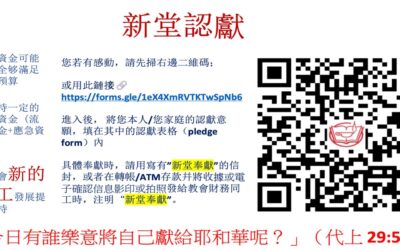 「今日有誰樂意將自己獻給耶和華呢?」(歷代志上 29:5下) 神是丰富的神,祂自己没有需要,却将各样的恩典,厚賜給眾人。大衛王曾想要為祂建聖殿,但神不容許,他說:「我心裡本想建造殿宇,安放耶和華的約櫃,作為我神的腳凳,我已經預備建造的材料, 只是神對我說:『你不可為我的名建造殿宇,因你是戰士,流了人的血。』」(代上28:2-3)可見得蒙神喜悅的大衛王,都沒有福份為神建殿。 在購買龍暉花園一事上,神藉著弟兄姊妹過往的奉獻,已經完成了;而在裝修、遷移的事上,依然有財務上的需要,我們盼望,這是神特別留給我們的機會,讓我們更加參與在神美好的聖工中。... Read More →