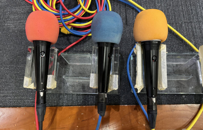 這裡有四支有線麥克風,它們沒有什麼大問題。其中一支黑色麥克風存在輕微噪音, 計劃多加1支
