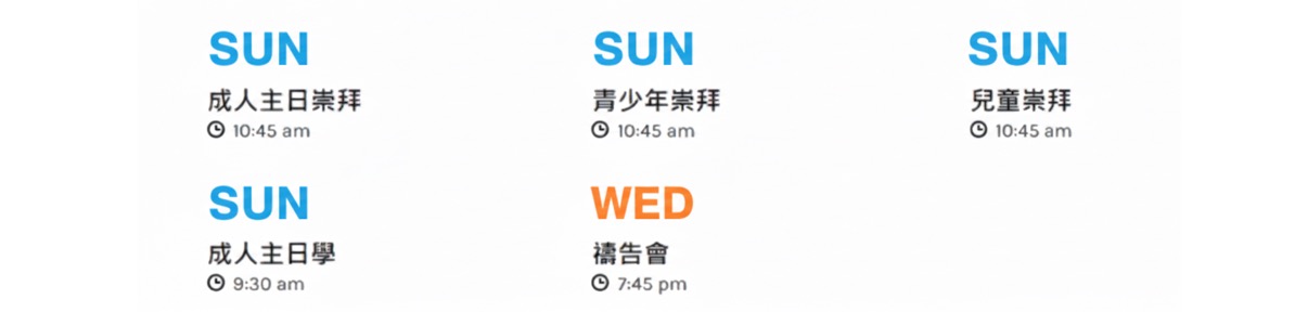 主日崇拜約九十分鐘,以普通話進行宣召、詩歌敬拜、講道、祝禱等環節。 在成人主日崇拜的同時,兒童和青少年可參加分齡主日學。 教會另設有嬰兒房和嬰兒看護,讓有小孩的家長可以安心參加崇拜。
