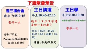 主內平安!  觀塘堂本周日主日崇拜的安排如下: